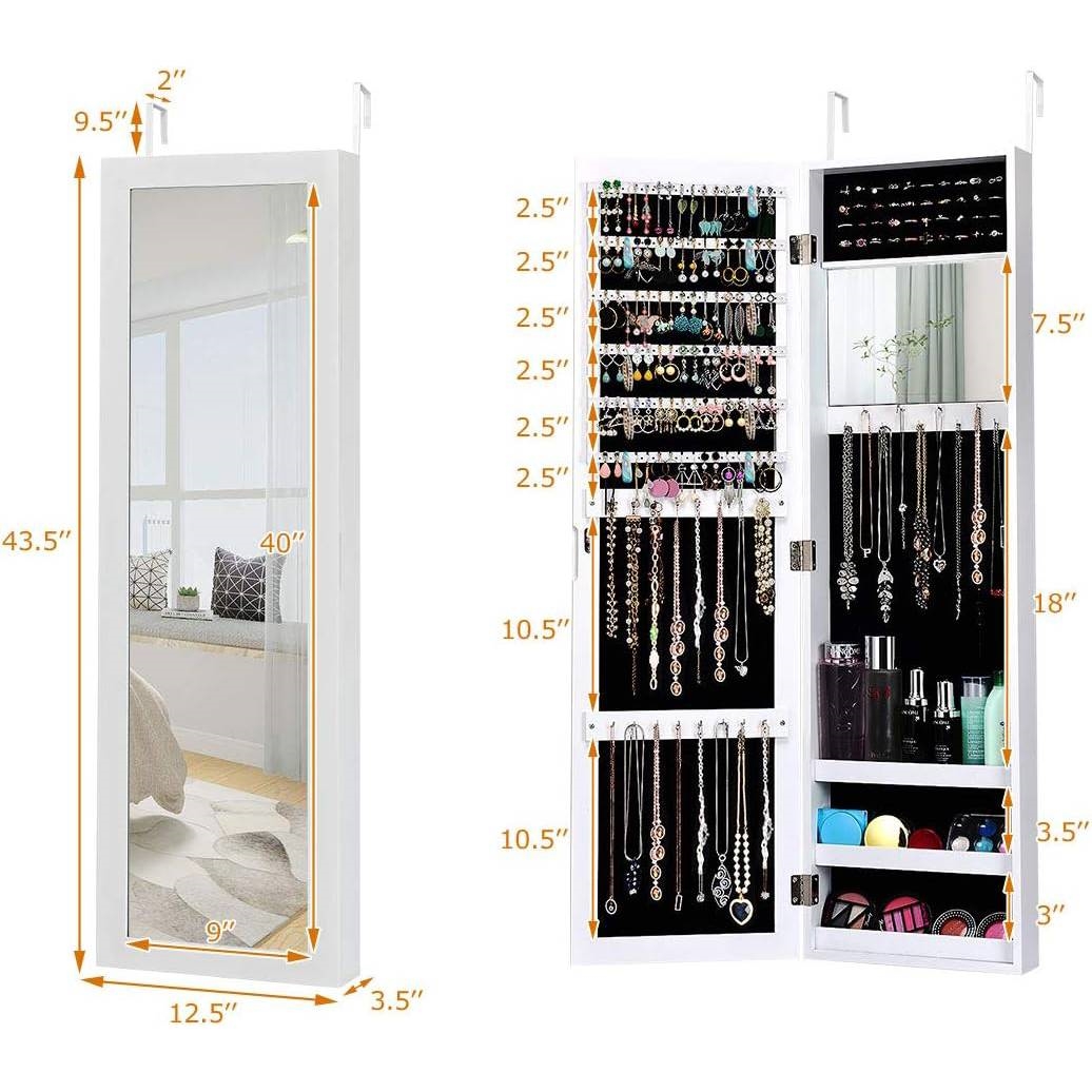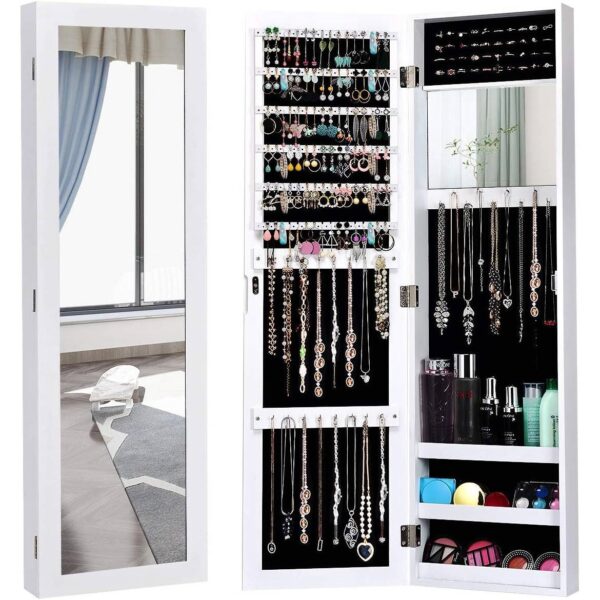 This 2-in-1 Wall or Door Mounted Jewelry Organizer Full Length Mirror in White is simple in shape and uses the MDF as main frame material. The frame is thick and with a certain strength, will not easy to warp or break. The cabinet can be both wall mounted and door mounted and the height is also adjustable as your needs. No matter which mounting you choose, it can save much space for you. Your room won’t be narrow and difficult to walk because of a big jewelry cabinet. The mounting height is adjustable. This 2-in-1 Wall or Door Mounted Jewelry Organizer Full Length Mirror in White is simple in shape and uses the MDF as main frame material. The frame is thick and with a certain strength. Do you want to keep all items organized and full of different types of storage organizers? This one keeps all your jewelry organized and neatly displayed. It includes 6 lined shelves designed for holding earrings, 25 hooks for necklace and bracelet, 4 rows of 40 ring slots, an inside makeup mirror.It helps you have a neat storage space and easy to find the right piece when you need it. Our MDF boards are specially customized. Our coating is very smooth and looks very textured. This 2-in-1 Wall or Door Mounted Jewelry Organizer Full Length Mirror in White is a combination of a full-length mirror and a jewelry cabinet. It can be used as a mirror for you to dress. It can also be used as a practical jewelry cabinet to store your daily jewelry, giving you a clean and spacious space. Besides, the inside mirror helps you have a clear reflection of yourself with the jewelers on.