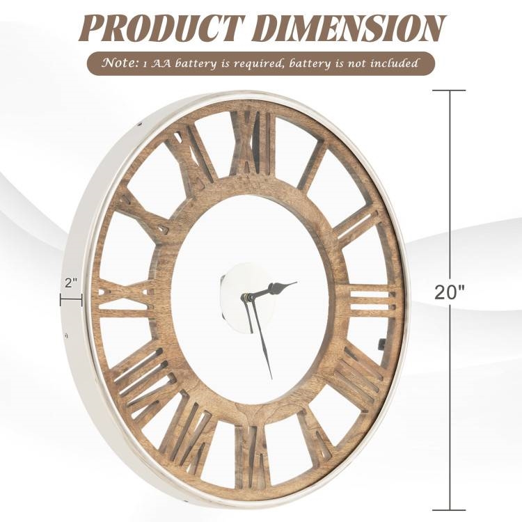 This 20-inch Classic Farmhouse Natural Wood Roman Numerals Wall Clock features a silent non-ticking clock design, allowing you to enjoy a peaceful environment without any annoying tick-tock sound. Moreover, the smooth quartz sweeping movement also guarantees accurate timekeeping. Measuring 2″ in deep, this 16″/ 20″ wall clock can elevate the aesthetic appeal of any room and boast a stylish design that blends seamlessly with a wide range of room decoration. Whether it’s for the living room, bedroom, office, or study, this clock will add a touch of elegance to any indoor space. Crafted with the utmost attention to detail, this wall clock is made of high-quality materials that exhibit excellent corrosion resistance and oxidation-resistance. Furthermore, its durable construction ensures long-lasting durability, providing accurate and dependable timekeeping for years to come. Surprise your loved ones with a truly unique and stylish decorative clock for their home. This clock combines stunning design with exceptional quality, making it the perfect gift for any special occasion. Whether it’s a housewarming party, anniversary, or birthday celebration, this clock is sure to impress and delight. Skip the hassle of assembly with this clock that comes ready to use. All you need to do is use the convenient back slot to easily hang it on the wall. Additionally, this clock requires 1 standard AA batteries (not included).