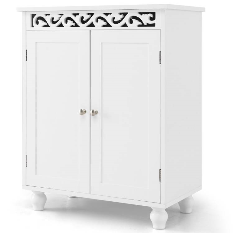 Enjoy more countertop space with the wide cabinet top of the bathroom cabinet, perfect for housing decorations. Beneath this generous surface lies an enclosed cabinet, offering large storage space for toiletries and towels. The Bathroom Floor Cabinet with 2 Storage Shelves in White Wood Finish has a 3-level adjustable shelf, with each level offering a 2.5″ adjustable spacing. Whether it’s tall bottles or stacks of towels, easily configure the space inside to accommodate items of varying sizes. The storage cabinet is complete with anti-tipping kits, ensuring it stays securely upright and providing higher security. Besides, it is designed with gourd-shaped solid wood legs that withstand a large weight up to 175 lbs. Designed with a painted surface and a ground clearance, the main body of the bathroom storage unit stays away from dirty ground. Therefore, it is perfect for the bathroom, kitchen, living room, dining room, and more. Elevate your bathroom’s aesthetic with the storage cabinets exquisite carving patterns that exude a classical charm. Not just a storage solution, this piece is a testament to exquisite design, adding timeless beauty to your space.