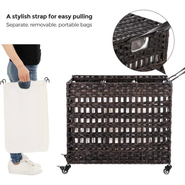 Has the overflow of laundry found its way into the middle of the room? It’s time to offer them a home with this Brown PP Rattan 3-Basket Laundry Hamper Sorter Cart with Removable Cotton Bags, which is handwoven in rattan style and will surely spice up your space. With this laundry sorter, you can sort your laundry by color or material before washing; there are 3 laundry bags available so you can keep your red socks from accidentally turning your clean, white shirt into pink. 3 bags are separate, removable, and with handles—now you don’t have to take everything out when you only want to wash the darks; just grab the bag of dark clothes and shake it all out into the washer. With 4 wheels and a stylish synthetic leather strap, even your kid can help roll or pull a weeks’ worth of laundry to the washer; 2 brakes allow you to lock it in place. A durable Laundry Basket with Wheels supported by a metal frame, 3 separate inner bags, foldable design, and easy assembly that can be done in minutes. It’s easy to toss your dirty clothes onto the chair or floor. But before you feel unhappy in a messy room and spend more time gathering them up, why not try this laundry basket with 3 compartments? The chaos is hidden under the lid, and even better, you can finish the sorting while tossing.