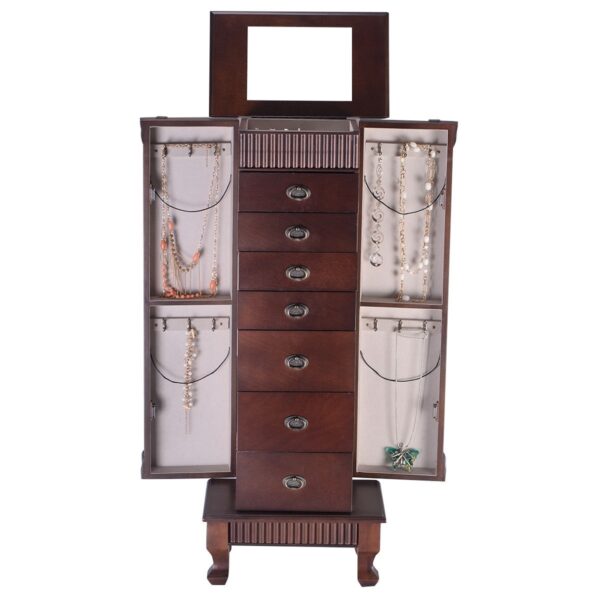 This Classic 7-Drawer Jewelry Armoire Wood Storage Chest Cabinet is perfect for any woman with an extensive jewelry collection. It features 7 different drawers that offer space to store all of your valuable jewels like bracelets, glasses, ties, scarves, watches, and perfumes. The cabinet also has a lift-top lid with a mirror and divided compartments to keep things organized. The jewelry armoire also features two swing-out doors with 6 hooks to hang your necklaces, bracelets and long earrings and prevent them from tangling and knots. The high stand design can prevent jewelry dampened. Don’t hesitate to buy it!
