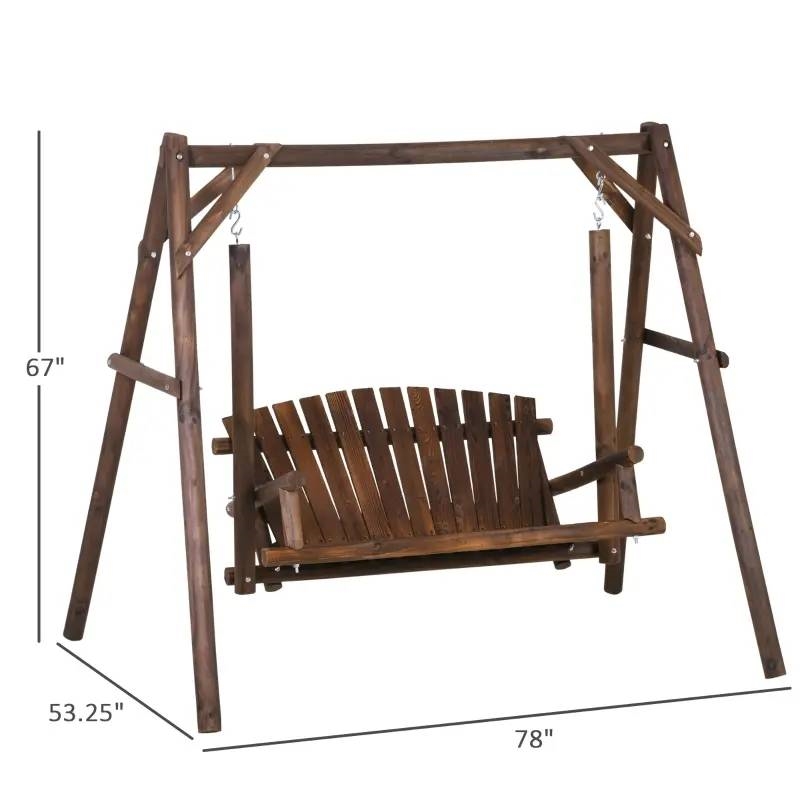 This rustic outdoor swing with stand is constructed from natural fir logs and is finished in a carbonized wood stain. Suitable as an outdoor swing chair, garden swing, backyard swing, lawn swing, patio swing chair, deck swing, or a yard swing. This backyard swings for adults includes the solid log A-frame, solid wood loveseat bench to seat two people, metal hooks for hanging, and all necessary hardware. Instructions are included for outdoor swing’s easy assembly. The outdoor swing chairs for adults features a wooden 2 person loveseat with armrests. The curved design of the outdoor swing bench seat and wide slats make this patio swing set comfortable for hours of reading, relaxing, and enjoying your outdoor space in style. This outside swings for adults is constructed of premium fir and pine wood with a finished surface, which is decay resistant. The outdoor swing seat’s a-frame design makes this swing stable and durable, which connects to the seat with heavy duty metal hooks.
