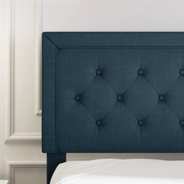 Upholstered linen and tufted button headboard, this classic silhouette matches a variety of bedroom styles. Thick dense foam padding gives you comfortable touch. The Interior steel framework supports your mattress firmly. Smartly packed all parts with instructions and tools in one box. Only takes about 30 minutes to assemble. Fabric upholstered bed frame with adjustable headboard. The distance between each slat is about 4 inches. The slats of this bed have to be screwed on and not hook & loop fastener. 6″ is a little low for the bed, but you can still use it if you do not care about the gap between the mattress to the headboard.