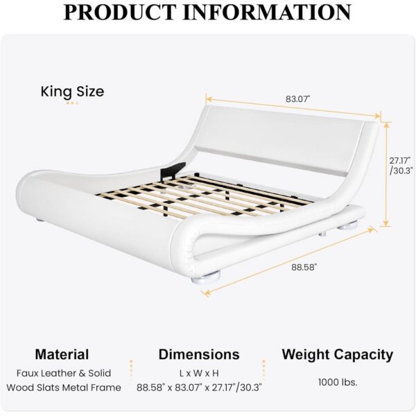 The King Modern White Upholstered Platform Bed Frame with Sleigh Curved Headboard has a streamlined design along with a curved headboard which makes your room a contemporary and futuristic aesthetic. 120° 2-level adjustable height headboard gives the waist a comfortable rest, perfect for reading, playing mobile phones, watching TV, etc. The sturdy construction is composed of solid wood slats and heavy-duty steel with a bold round-shape leg design. No squeaky sound. Maximum capacity 800 lbs. Fully embedded design can prevent the mattress from sliding and provide a sweet dream. Mattress + spring box is recommended not to exceed 14 inches. 100% Premium PU leather filled with high-density PP cotton, ultra-soft texture, breathable, easy to clean, wear-resistant.