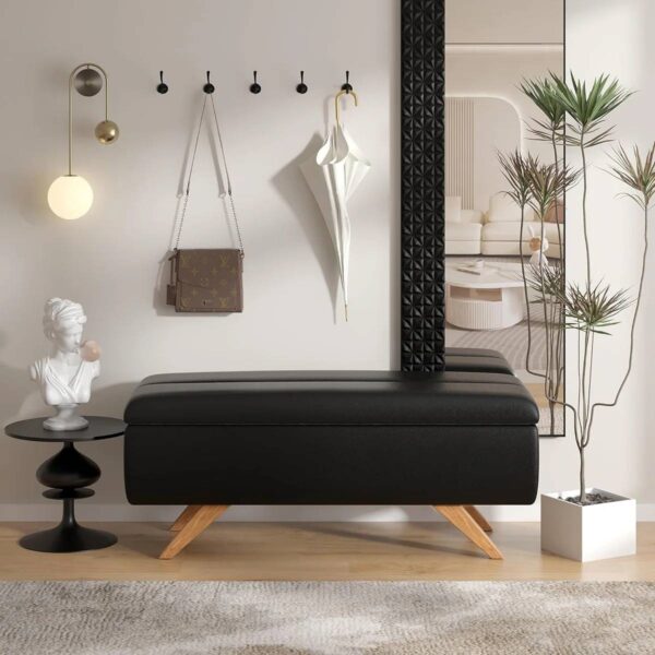 With a large capacity, our Mid-Century Modern Black Faux Leather End of Bed Storage Bench Ottoman neatly stows everything from your blankets and pillows to clothes. The hydraulic rod on the lid, unlike those with hinges, promises smooth, safe operation and efficient access to your items. Size and feel work together to determine how you feel when you sit on the bench. Measuring 44.49 x 15.75 x 16.14” (L x W x H), this bench is just the right height, width and length. You can easily put on your shoes or keep your feet firmly planted on the floor without bending or extending your knees too much. With 6.1 “of storage space, it greatly enhances practicality. Easy to assemble in less than 5 minutes, the Upholstered Bench brings elegance to your living room, bedroom or entryway. Whether you place it at the end of your bed, in your entryway, or in your living room, you’ll find that this bench is perfect for any space and is the ultimate finishing touch. Glide your hand over the smooth, easy-to-clean cover, then sink into the supportive 25D high-resilience foam that resists deformation. With PU Leather top, unlike those with fabric cover, this storage bench, offers both a cozy seat and effortless upkeep. With anti-noise foot pads, smooth hydraulic rods, our storage bench, keep you away from crunch-crunch, protecting your floors. The hydraulic rod achieves continuous and smooth motion, avoiding noise during opening and closing, eliminating the risk of sudden closure accidents.