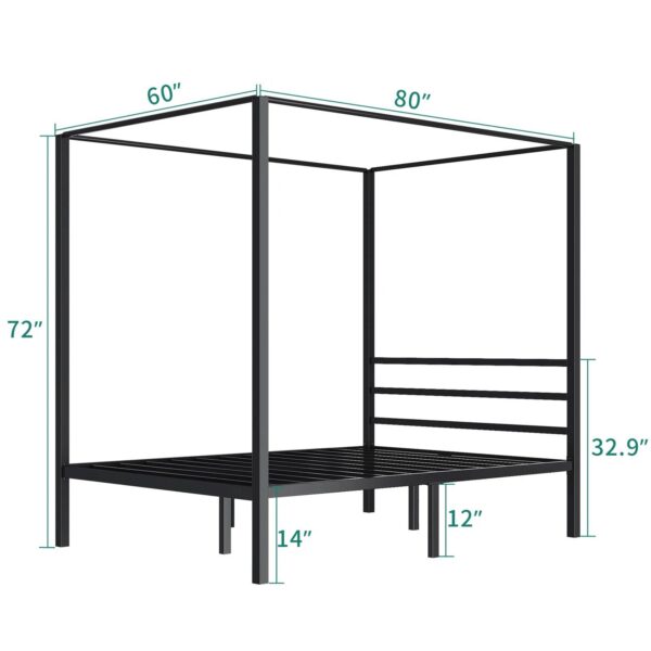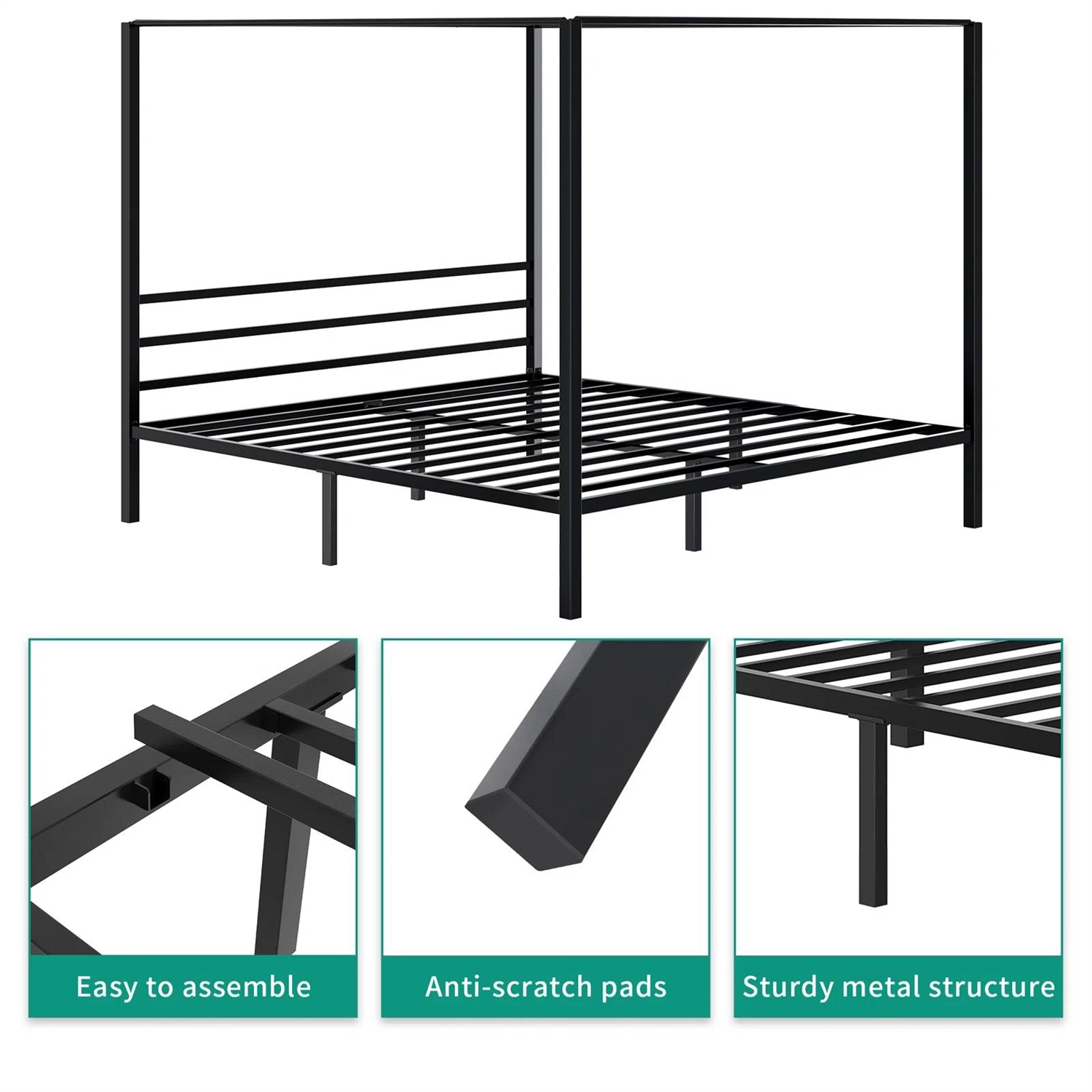 This Queen size Modern Four Poster Metal Canopy Bed in Black Finish combines a minimalist aesthetic with a gorgeous look in the bedroom and is made from sturdy metal for stability and durability. Comes with baseless safety metal slats and center legs for full support for you and your mattress. The support legs in the middle of the bed frame can improve overall stability. The sturdy slats provide strong support and prevent the mattress from sagging, which can prolong the life of your mattress. Beneath the canopy, the bed has a storage space of up to 12 inches, where you can store your suitcases and other items. The classic, simple look offers your bedroom a peaceful and harmonious aesthetic. The thick and sturdy frame is made of metal, providing a longer service life. Please follow the instructions, and professional installation recommended Box Spring is Needed.