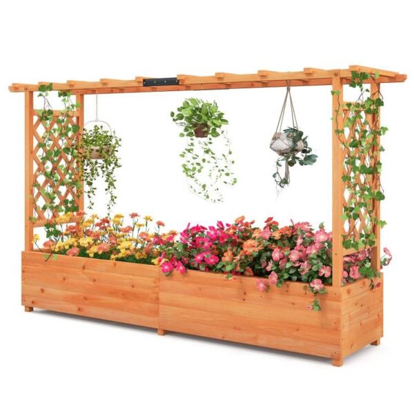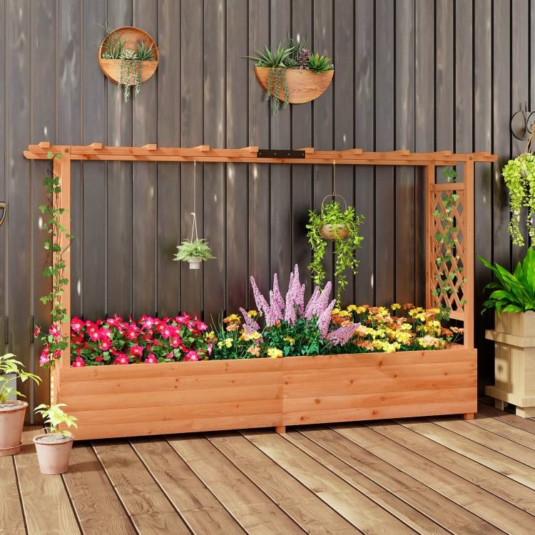 Grow Thyme!! This Solid Fir Wood Rectangle Raised Garden Bed with Side Trellis is crafted of 100% natural fir wood with waterproof painting, which is characterized by high strength, deformation resistance, and weather resistance, ensuring long-term use. The outdoor wooden planter is designed with a large planter box for cultivating various plants, such as flowers, herbs, vegetables, fruits, etc. The planter box features drainage hole and bottom gap design, which could help drain excessive water and prevent roots from rotting. The bottom panels can be detached to create an open-ended base for cultivating long-root plants. The vertical plant container with bright colors and natural wood grains can be a perfect addition to any indoor and outdoor area, such as the balcony, terrace, porch, garden, patio, deck, and more, adding a touch of green and vitality to your living space.