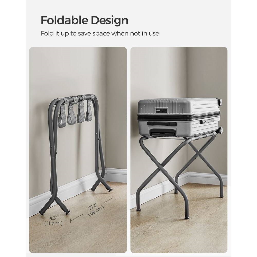 Make your guests’ stay more comfortable with this Sturdy Grey Metal Folding Luggage Rack. It keeps the luggage off the floor to save you or your guests from bending down to the floor, making packing and unpacking for trips much more easier. Fastened to the steel frame, the nylon straps will always stay in place without moving during use; the suitcase stand is strong to hold up to 110 lb; the adjustable feet improve the stability and won’t scratch the floor. This luggage rack conveniently folds to a size of 27.2”D x 4.3”W x 26”H (69 x 11 x 66 cm) for easy storage in smaller spaces. Its standing size of 27.2”D x 15”W x 20.5”H (69 x 38 x 52 cm) can accommodate 22”, 24”, or 26” suitcases. A steel luggage rack for guest rooms with a foldable design, adding extra storage while being a nice touch to any room.